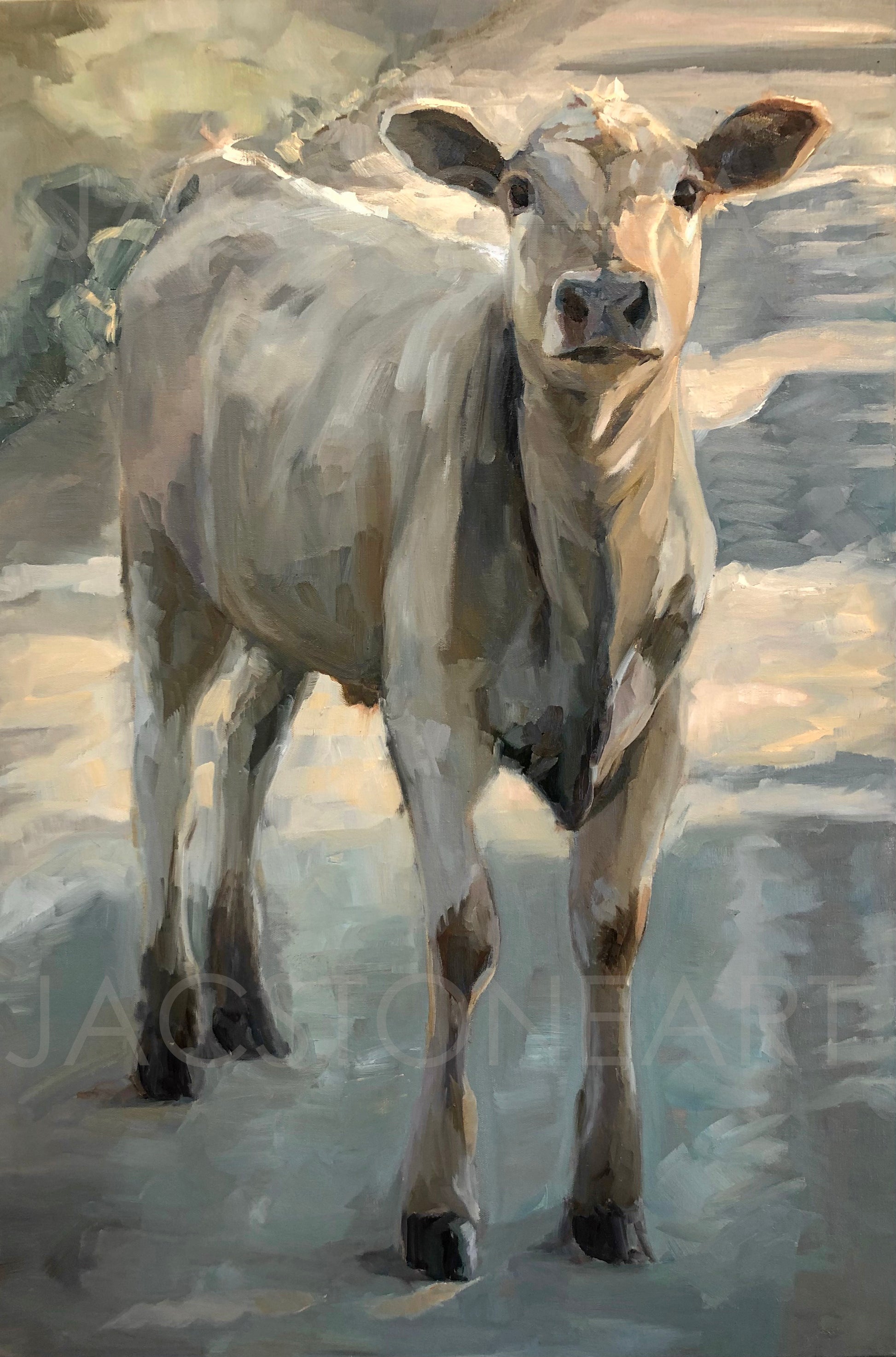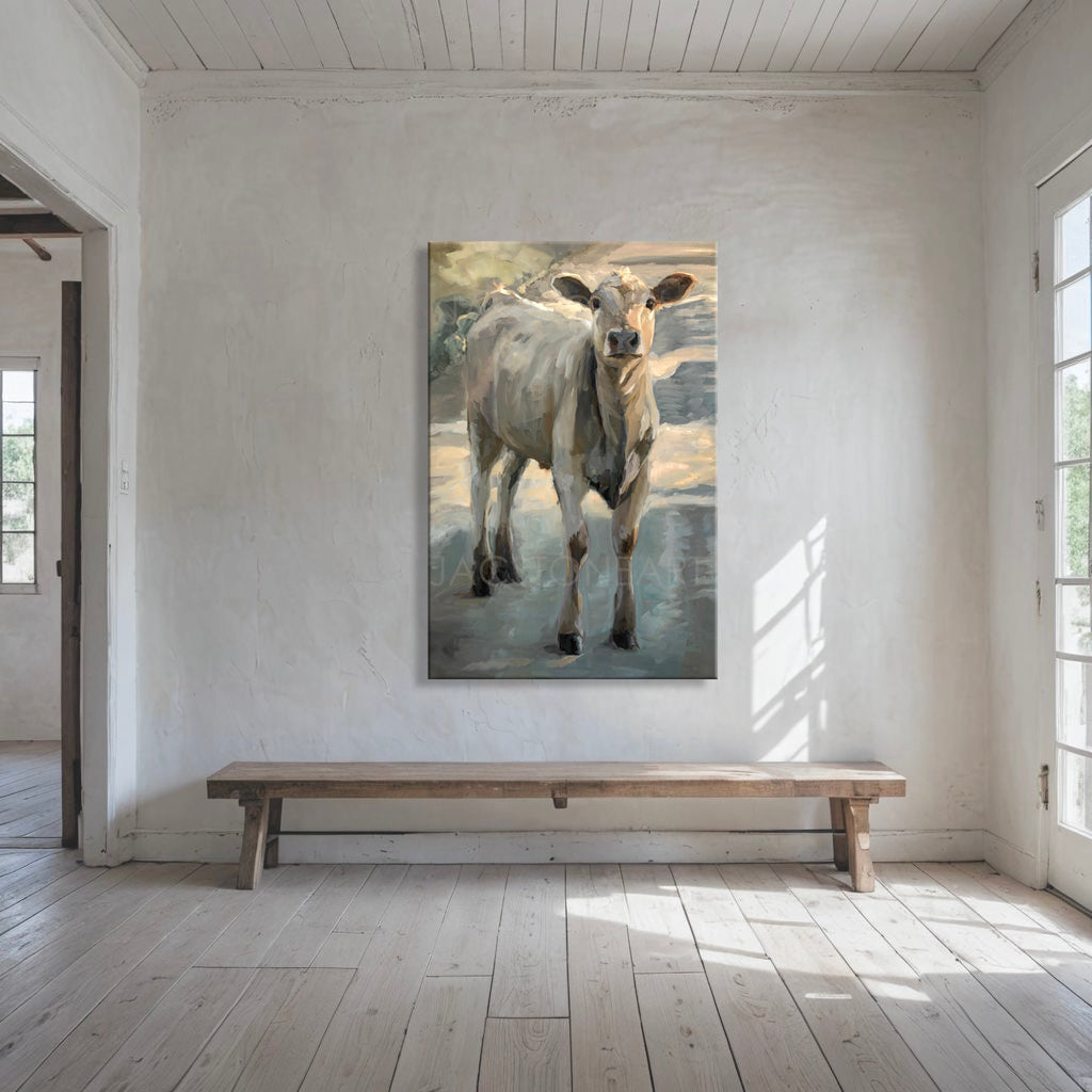 The image is a painting of a young cow, or calf, standing on what seems to be a dirt surface. The calf is depicted looking directly at the viewer with a curious or inquisitive expression. The background of the painting consists of earthy tones, possibly indicating a natural or rural setting. The calf in the painting is light-colored with delicate features and a gentle stance. The artist's use of brush strokes and blending of colors suggests an impressionistic style, lending the artwork a vibrant and rustic feel.